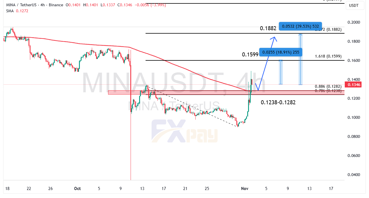 قیمت فعلی MINAUSDT در محدوده ۰/۱۳۴ دلار قرار دارد و نمودار چهارساعته نشان میدهد که رمزارز مینا پس از ماهها اصلاح نزولی، موفق به شکست خط روند نزولی و عبور پرقدرت از میانگین متحرک ۰/۱۲۷ دلار شده است.