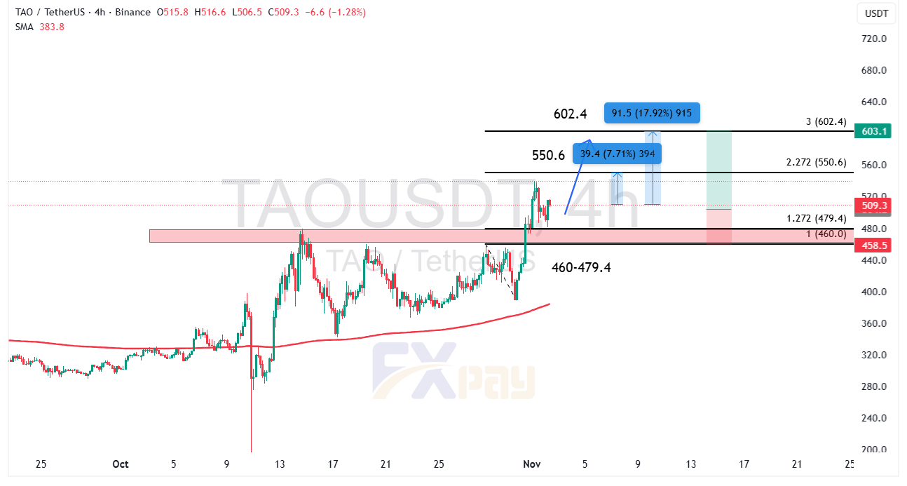 قیمت فعلی TAOUSDT در حدود ۵۰۸ دلار قرار دارد و نمودار ۴ ساعته نشان میدهد که پس از شکست مقاومت کلیدی ۴۸۰ دلار، بازار موفق به تثبیت بالای میانگین متحرک SMA200 (در نزدیکی ۳۸۴ دلار) شده است.این تثبیت، نشان از تغییر ساختار میانمدت از حالت خنثی به صعودی فعال دارد.