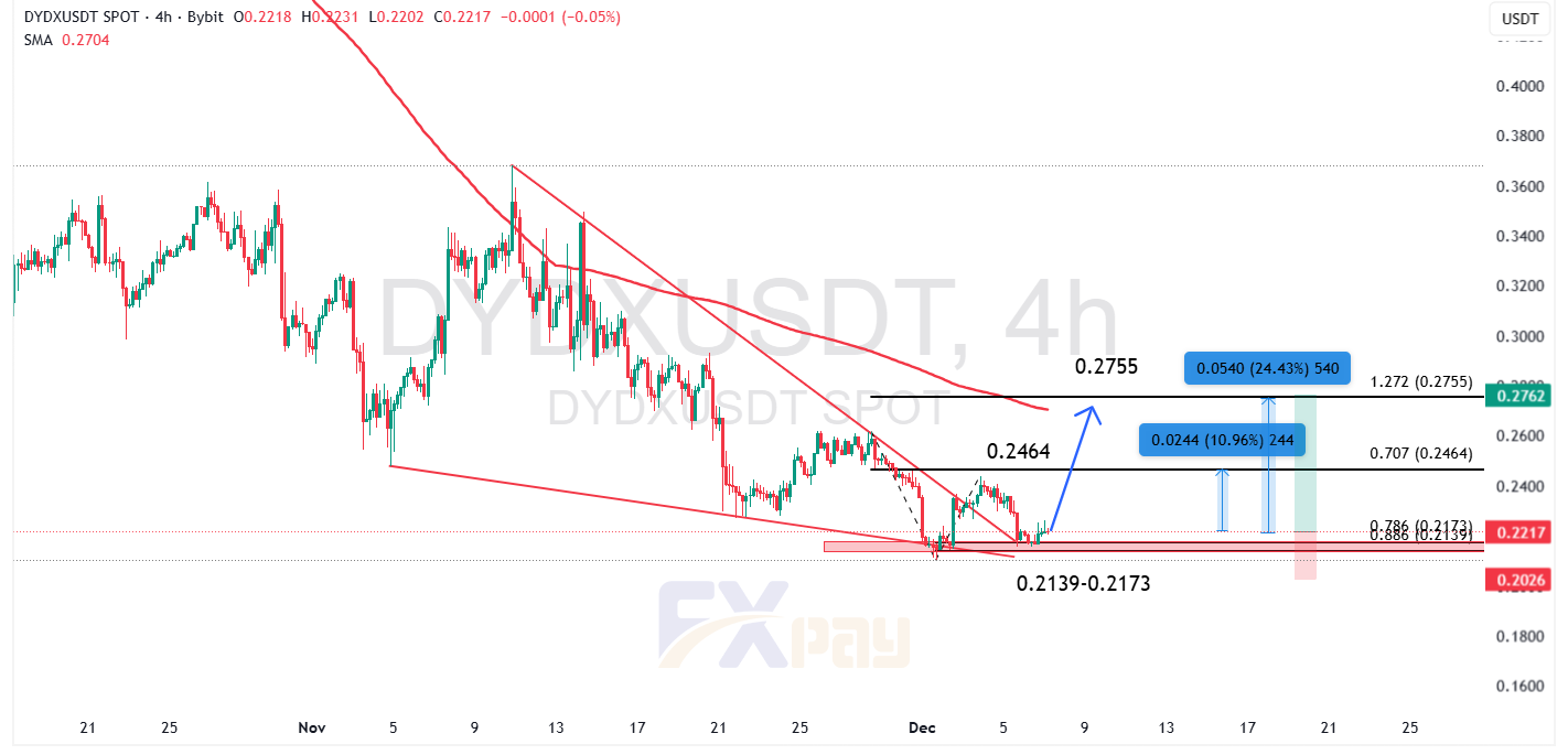 قیمت توکن صرافی dYdX در حال حاضر در محدوده حمایتی ۰/۲۱۳۹ تا ۰/۲۱۷۳ دلار قرار دارد؛ ناحیهای که با فیبوناچی ۰/۷۰۷ و ۰/۸۸۶ همپوشانی داشته و همزمان کف الگوی کنج نزولی (Falling Wedge) نیز در همین محدوده قرار گرفته است. تشکیل کندلهای بازگشتی و سایههای پیدرپی در این محدوده نشان میدهد که فروشندگان نتوانستهاند حمایت را بشکنند و خریداران در حال ورود تدریجی هستند.