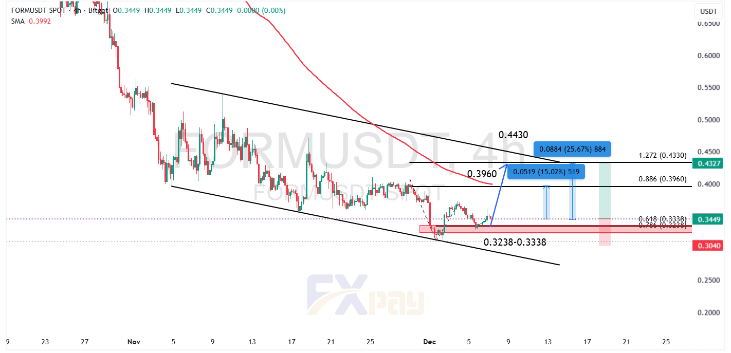 قیمت میمکوین فرم ( FORMUSDT ) مدتها داخل یک کانال نزولی میانمدت در حال حرکت بوده و اکنون دقیقاً روی ناحیهی حمایتی بسیار مهم ۰/۳۲۳۸ تا ۰/۳۳۳۸ دلار قرار دارد؛ ناحیهای که با فیبو ۰/۶۱۸ و ۰/۷۸۶ همپوشانی داشته و بارها نقش کف داینامیک روند را ایفا کرده است.