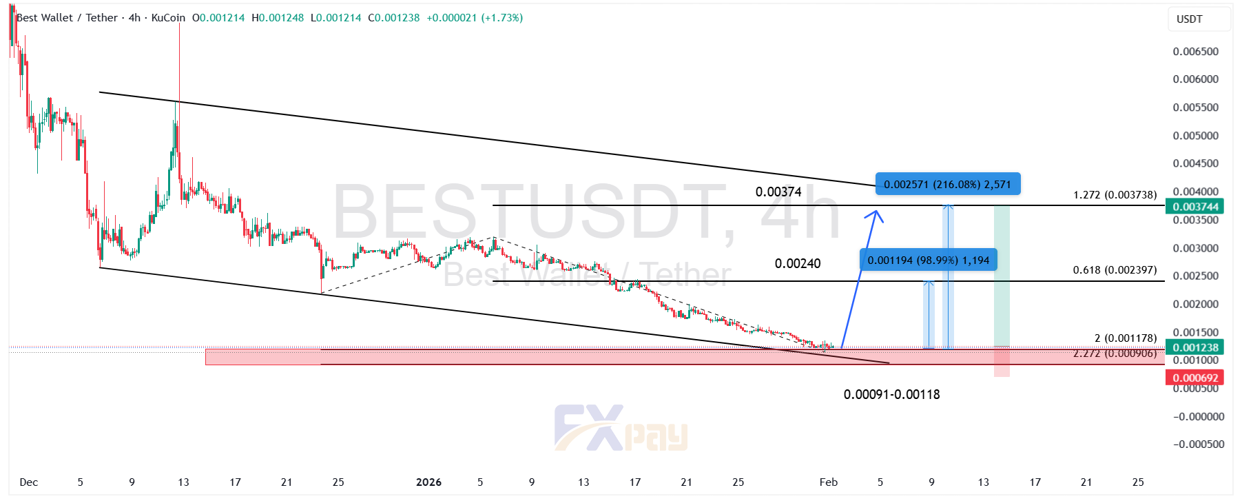 قیمت BEST پس از یک روند نزولی ممتد، اکنون در محدوده حمایتی بسیار حیاتی ۰/۰۰۰۹۱–۰/۰۰۱۱۸ دلار قرار گرفته است. این ناحیه که با سطوح ۲ و ۲/۲۷۲ فیبوناچی اکستنشن همپوشانی دارد، به عنوان یک محدوده بازگشتی مستحکم شناخته میشود که فشار فروش در آن به شدت کاهش یافته است.