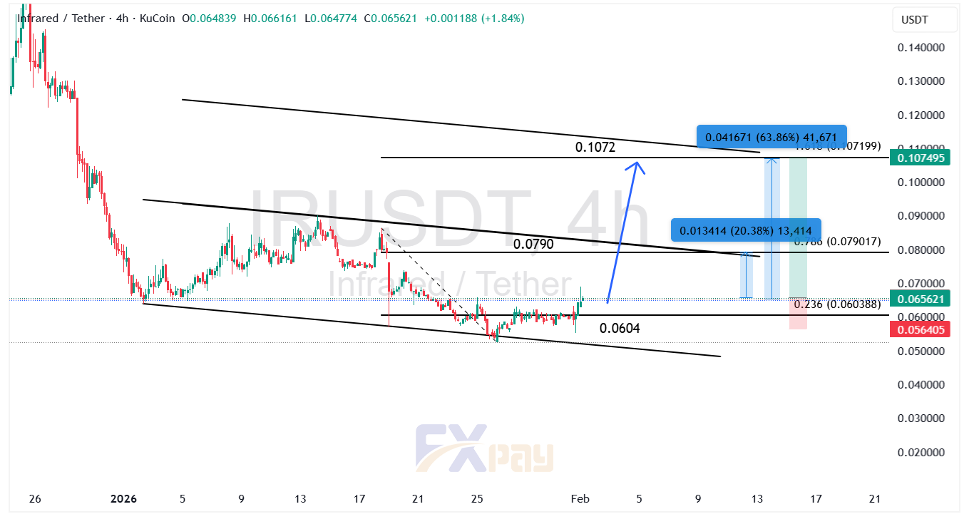 قیمت Infrared که با نماد IR نمایش داده میشود پس از یک دوره اصلاح و نوسان در قالب یک ساختار نزولی، اکنون در محدوده حمایتی معتبر ۰/۰۵۶۴–۰/۰۶۰۴ دلار با واکنش مثبت خریداران و افزایش تقاضا مواجه شده است. این محدوده که با سطح ۰/۲۳۶ فیبوناچی و کف کانال نزولی همپوشانی دارد، مانع از ریزش بیشتر قیمت شده و زمینهساز تشکیل یک کف حمایتی مستحکم شده است.