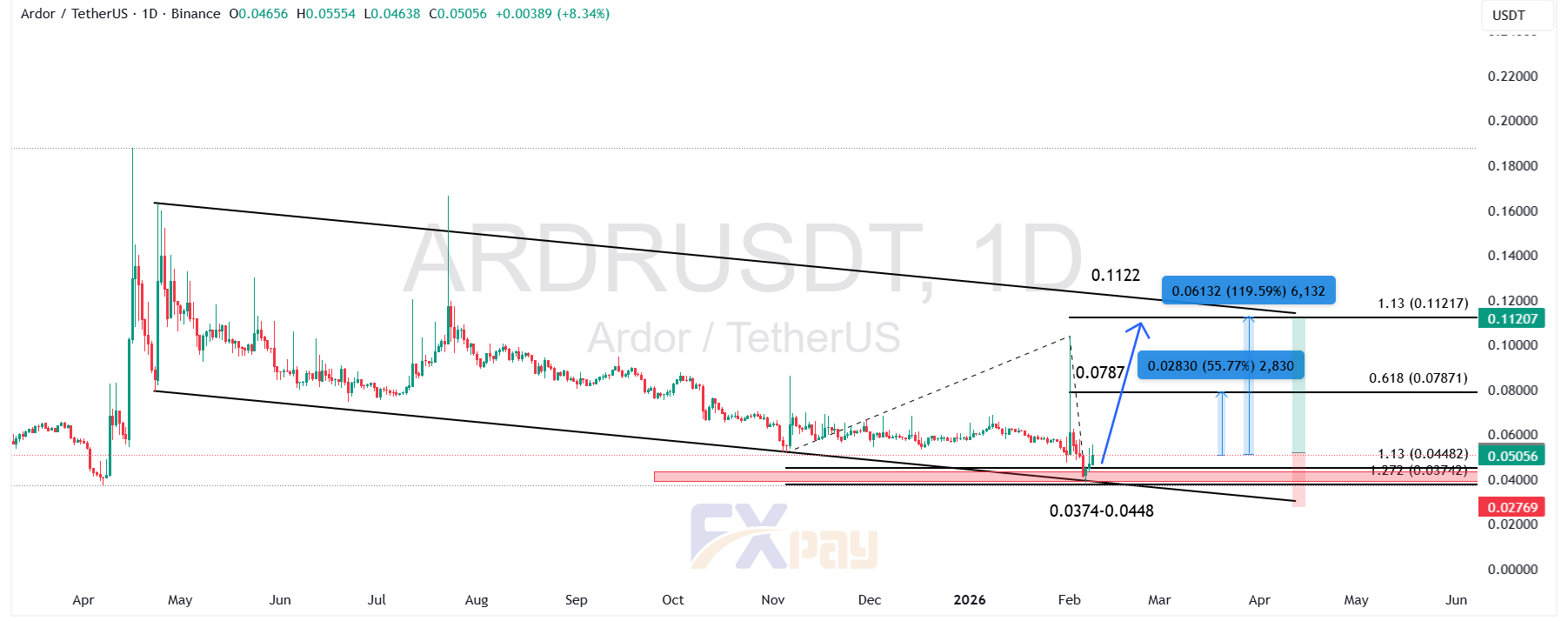 قیمت ارز دیجیتال آردور (Ardor) که با نماد ARDR نمایش داده میشود پس از یک دوره اصلاح و نوسان در قالب یک ساختار نزولی، اکنون در محدوده حمایتی معتبر ۰/۰۳۷۴–۰/۰۴۴۸ دلار با واکنش مثبت خریداران و افزایش تقاضا مواجه شده است. این محدوده که با سطوح ۱/۱۳ و ۱/۲۷۲ فیبوناچی اکستنشن و کف کانال نزولی همپوشانی دارد، مانع از ریزش بیشتر قیمت شده و زمینهساز تشکیل یک کف حمایتی مستحکم شده است.