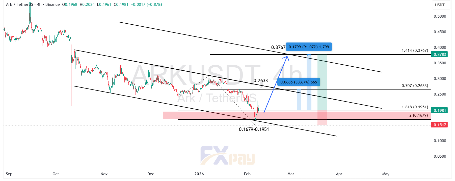 قیمت ارز دیجیتال آرک (ARK) که با نماد ARK نمایش داده میشود پس از یک دوره اصلاح و نوسان در قالب یک ساختار نزولی، اکنون در محدوده حمایتی معتبر ۰/۱۶۷۹–۰/۱۹۵۱ دلار با واکنش مثبت خریداران و افزایش تقاضا مواجه شده است. این محدوده که با سطح ۲ فیبوناچی اکستنشن و کف کانال نزولی همپوشانی دارد، مانع از ریزش بیشتر قیمت شده و زمینهساز تشکیل یک کف حمایتی مستحکم شده است.
