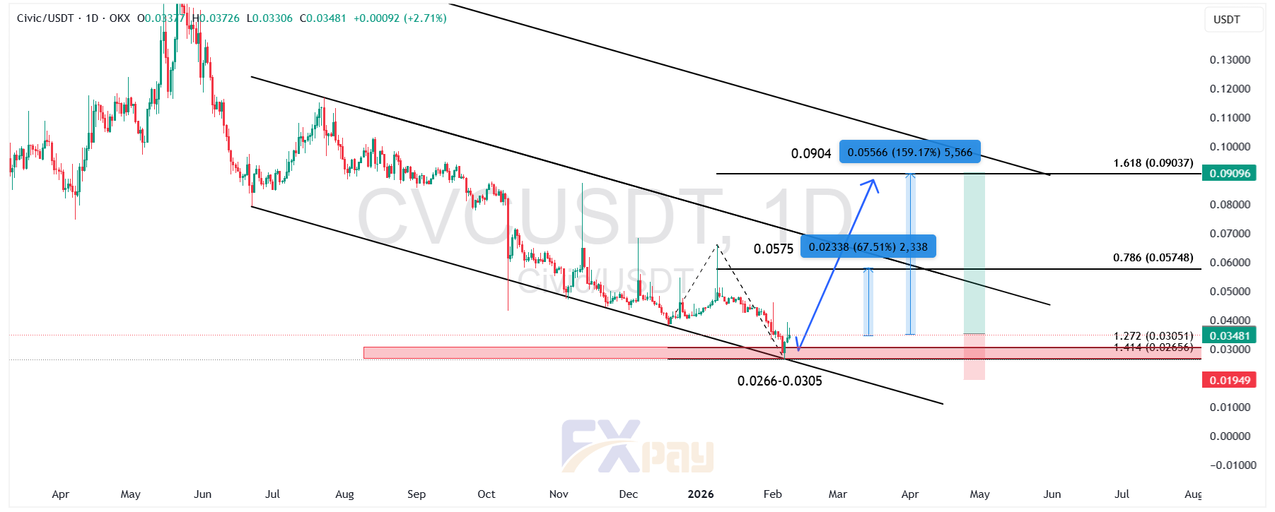 قیمت ارز دیجیتال سیویک ( Civic ) که با نماد CVC نمایش داده میشود پس از یک دوره اصلاح و نوسان در قالب یک ساختار نزولی، اکنون در محدوده حمایتی معتبر ۰/۰۲۶۶–۰/۰۳۰۵ دلار با واکنش مثبت خریداران و افزایش تقاضا مواجه شده است. این محدوده که با سطوح ۱/۲۷۲ و ۱/۴۱۴ فیبوناچی اکستنشن و کف کانال نزولی همپوشانی دارد، مانع از ریزش بیشتر قیمت شده و زمینهساز تشکیل یک کف حمایتی مستحکم شده است.