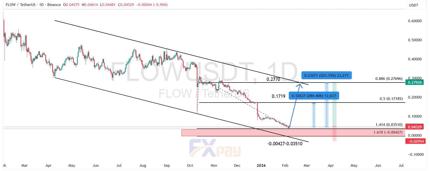 قیمت ارز دیجیتال Flow ٬ پس از یک دوره اصلاح طولانی و نوسان در قالب یک ساختار نزولی، اکنون در محدوده حمایتی معتبر ۰/۰۰۴۲۷- تا ۰/۰۳۵۱۰ دلار با واکنش مثبت خریداران مواجه شده است. این محدوده که با سطوح ۱/۴۱۴ و ۱/۶۱۸ فیبوناچی اکستنشن و کف کانال نزولی همپوشانی دارد، مانع از ریزش بیشتر قیمت شده و زمینهساز تشکیل یک کف حمایتی مستحکم شده است.
