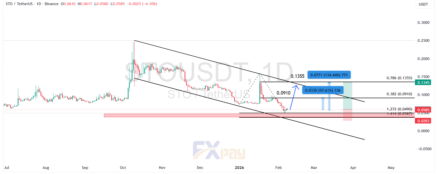 قیکمت ارز دیجیتال استیک استون که با نماد STO نمایش داده میشود پس از یک دوره اصلاح و نوسان در قالب یک ساختار نزولی، اکنون در محدوده حمایتی معتبر ۰/۰۳۶۷–۰/۰۴۹۰ دلار با واکنش مثبت خریداران و افزایش تقاضا مواجه شده است. این محدوده که با سطوح ۱/۲۷۲ و ۱/۴۱۴ فیبوناچی اکستنشن و کف کانال نزولی همپوشانی دارد، مانع از ریزش بیشتر قیمت شده و زمینهساز تشکیل یک کف حمایتی مستحکم شده است.