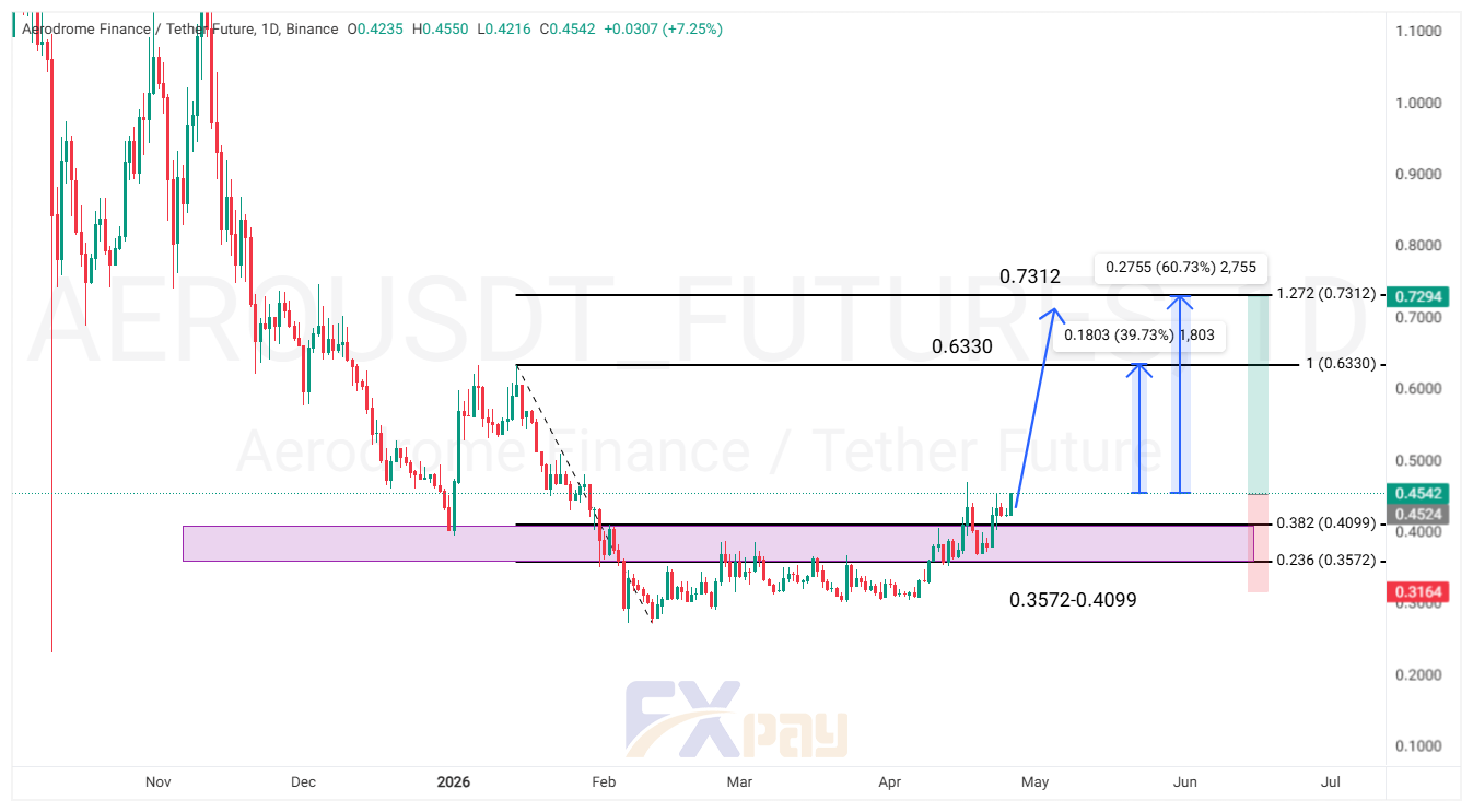 قیمت آئرودروم (AERO) پس از یک روند نزولی طولانی، در ناحیه حمایتی بسیار مهم ۰/۳۵۷۲ تا ۰/۴۰۹۹ دلار وارد فاز تثبیت و بازگشت شده است. این محدوده که ترکیبی از حمایت ساختاری چندماهه و سطوح فیبوناچی ۰/۲۳۶ و ۰/۳۸۲ است، طی هفتههای اخیر با قدرت حفظ شده و اکنون نقش یک زون تقاضای معتبر را بازی میکند.