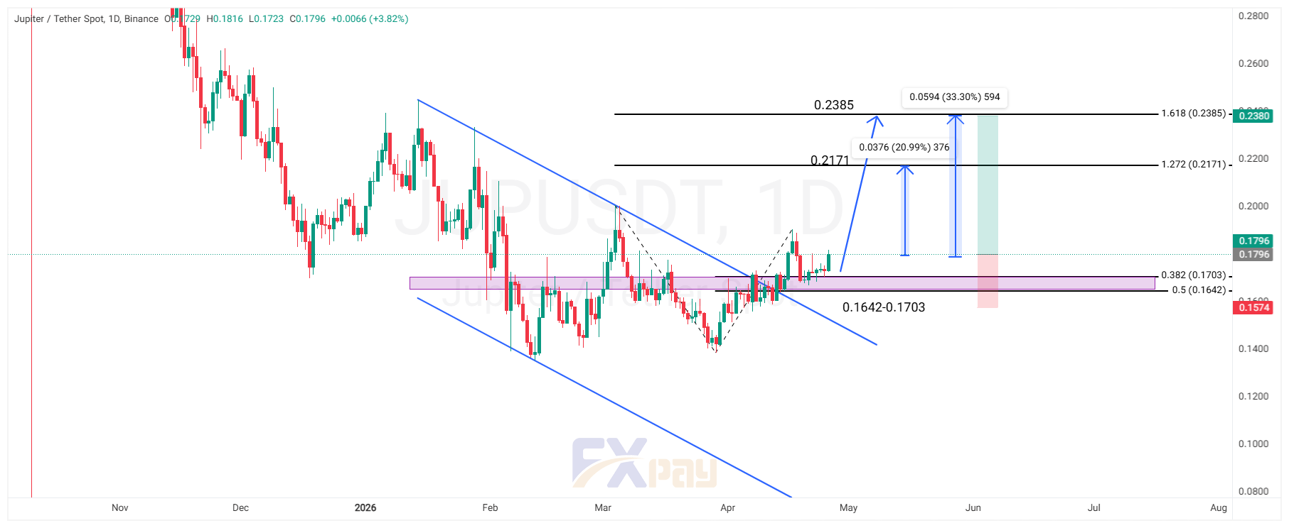 قیمت ژوپیتر (JUP) پس از یک روند نزولی بلندمدت که در قالب یک کانال/گوه نزولی (Falling Wedge) شکل گرفته بود، اکنون با قدرت این الگو را به سمت بالا شکسته و پولبک خود را به محدوده حمایتی ۰/۱۶۴۲ تا ۰/۱۷۰۳ دلار تکمیل کرده است. این ناحیه حمایتی با سطوح فیبوناچی ۰/۳۸۲ و ۰/۵۰ همپوشانی دارد و پیشتر نیز چندین بار بهعنوان حمایت/مقاومت کلیدی عمل کرده است؛ لذا بار دیگر به یک حمایت معتبر و ساختاری تبدیل شده است.