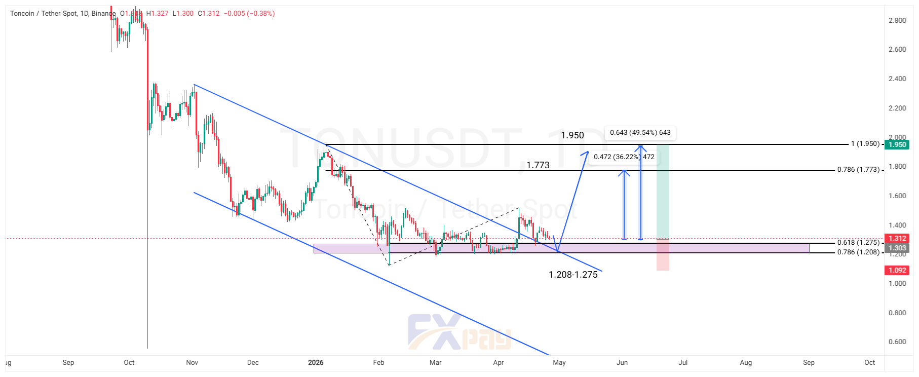 قیمت تون کوین (TONUSDT) پس از یک روند نزولی در قالب کانال کاهشی، وارد فاز اصلاح و تثبیت شده و در حال حاضر بالای محدوده حمایتی بسیار مهم ۱/۲۰۸ تا ۱/۲۷۵ دلار در حال نوسان است. این ناحیه حمایتی با سطوح ۰/۶۱۸ و ۰/۷۸۶ فیبوناچی همپوشانی داشته و در گذشته نیز بهعنوان محدوده واکنش قیمتی و حمایت مهم عمل کرده است.