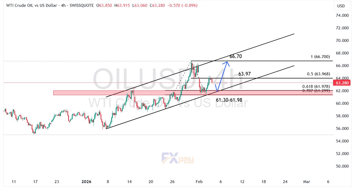 در بررسی نمودار آپدیت شده در تایم فریم ۴ ساعته، نفت WTI پس از شکست قدرتمند ساختار قبلی، اکنون درون یک کانال صعودی تازه تاسیس در حرکت است. قیمت اخیراً اصلاحی (Pullback) را به سمت ناحیه حمایتی معتبر ۶۱/۳۰ تا ۶۱/۹۸ دلار (باکس قرمز رنگ) انجام داده است.