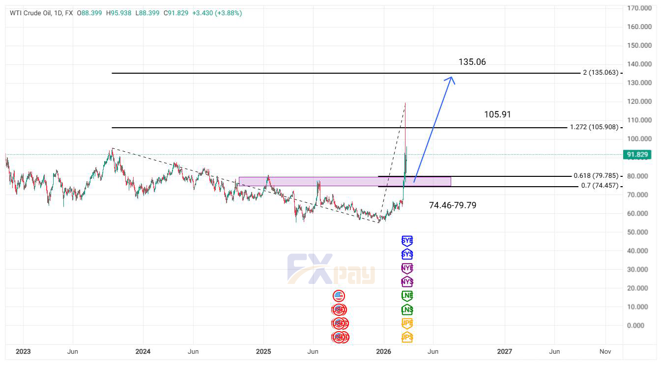 از نظر تکنیکال، نفت از ساختار نزولی چندماهه خارج شده و اکنون بالای محدوده حمایتی مهم ۷۴/۴۶ تا ۷۹/۷۹ معامله میشود. حفظ این ناحیه میتواند مسیر رشد قیمت را هموار کند و در این صورت احتمال حرکت به سمت مقاومت ۱۰۵/۹۱ و در ادامه هدف بلندمدت ۱۳۵/۰۶ افزایش مییابد.