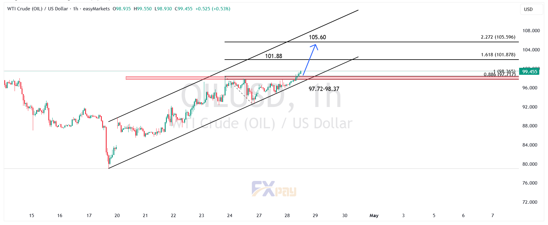 • حد ضرر (شرط خروج قطعی): تثبیت و بسته شدن کندل قیمت در زیر مرز ۹۷/۵۰ دلار. اگر قیمت به زیر این عدد سقوط کند، یعنی ساختار بازار تغییر کرده و باید با پذیرش ضرر کوچک از معامله خارج شد.