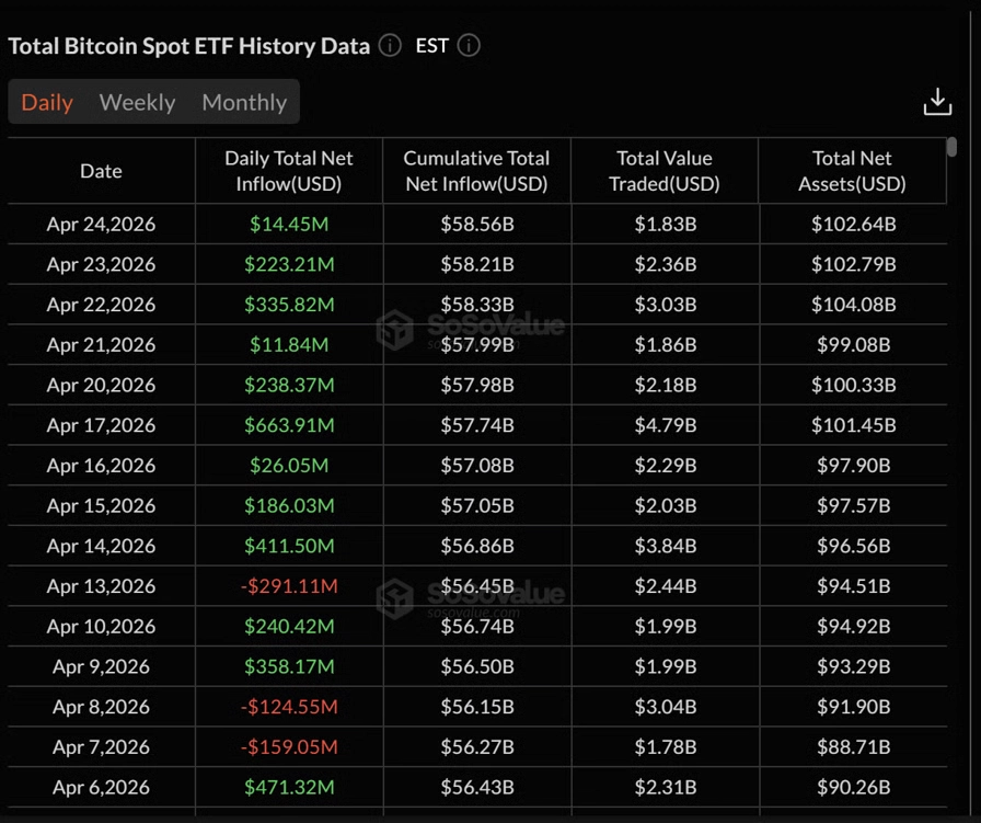 این روند متوالی در ماه آوریل، اولین دوره ۹ روزهی مثبت برای ETFهای اسپات بیتکوین (BTC) پس از روند مشابهی در ماه اکتبر است؛ زمانی که جریانهای ورودی به شدت افزایش یافت و شامل جذب ۱/۲۱ میلیارد دلار در ۶ اکتبر و ۸۷۵/۶ میلیون دلار در ۷ اکتبر بود.