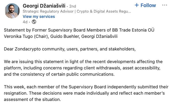 گئورگی دژانیاشویلی (Georgi Džaniašvili)، عضو سابق هیئت مدیره، روز دوشنبه در پستی در لینکدین (LinkedIn) گفت که هیئت مدیره از طریق گزارشهای رسانهها (و نه به صورت درونسازمانی) از مقیاس بحران زونداکریپتو مطلع شده است. او همچنین به «تناقضات اساسی» میان اظهارات عمومی و اطلاعاتِ در دسترسِ هیئت مدیره اشاره کرد.