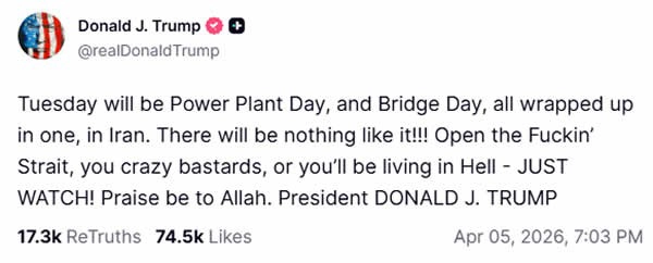 ترامپ روز یکشنبه در پستی پر از الفاظ تند در پلتفرم «تروث سوشال» (Truth Social) تهدید کرد که اگر تنگه هرمز بازگشایی نشود، ایران «در جهنم زندگی خواهد کرد». با این حال، او در مصاحبهای با فاکس نیوز اذعان کرد که ایران «اکنون در حال مذاکره است» و نسبت به «شانس خوب» برای دستیابی به یک توافق در عرض ۲۴ ساعت ابراز خوشبینی کرد.