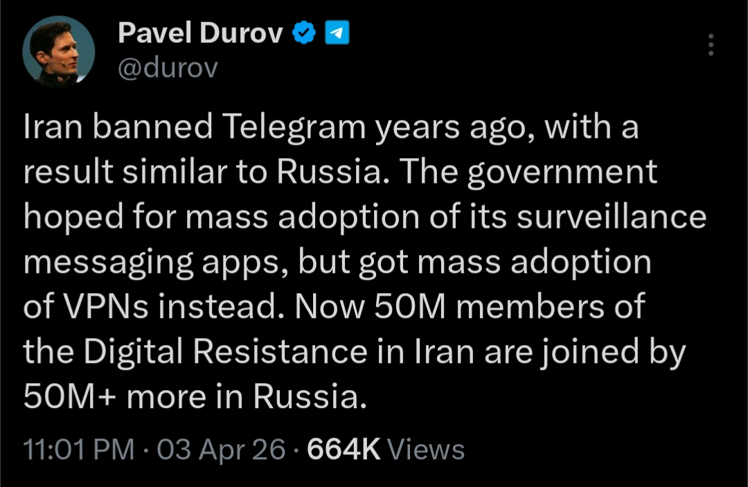 «دولت به پذیرش گسترده پیامرسانهای نظارتی خود امید داشت، اما در عوض شاهد پذیرش گسترده VPNها بود. اکنون بیش از ۵۰ میلیون نفر از اعضای مقاومت دیجیتال در ایران، به بیش از ۵۰ میلیون نفر دیگر در روسیه پیوستهاند.»