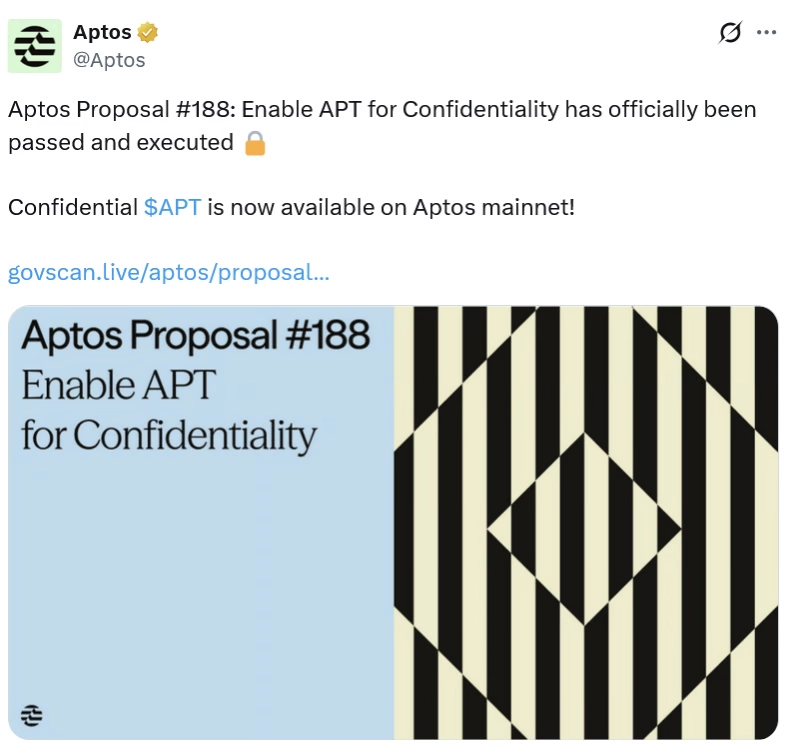 توکن «آپتوس محرمانه» (Confidential APT) روز جمعه پس از آنکه یک پروپوزال حاکمیتی برای ادغام این ویژگی حریم خصوصی با رأی تقریباً متفقالقول به تصویب رسید، در شبکه اصلی (Mainnet) آپتوس راهاندازی شد. این توکن از اثباتهای دانشصفر (Zero-knowledge Proofs) برای پنهان کردن موجودی توکن و مبالغ انتقالی استفاده میکند، در حالی که همچنان امکان تأیید و اعتبارسنجی تراکنشها را فراهم میسازد.