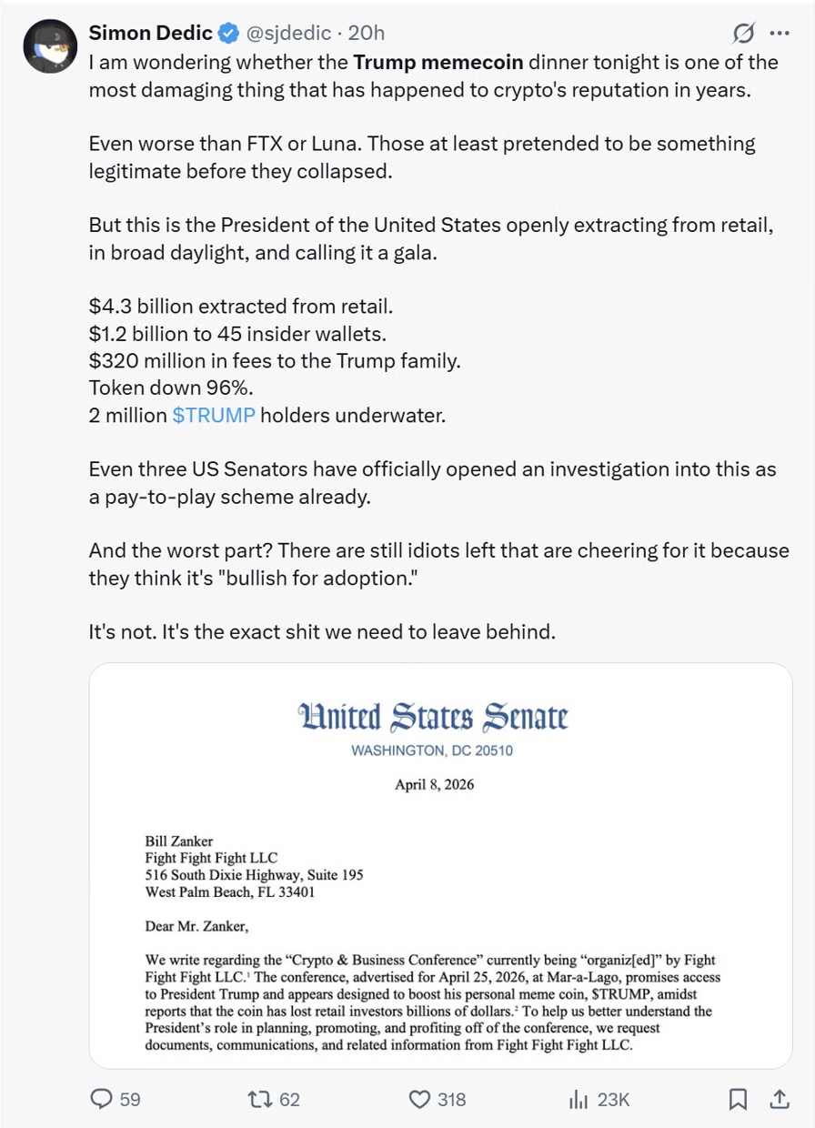 در این نامه آمده است: «سازماندهندگان در حال تبلیغ کنفرانسی هستند که با وعدهی دسترسی به رئیسجمهور ترامپ، شرکتکنندگان بالقوه را ترغیب میکند (و با این کار، خرید میمکوین او را تشویق میکنند که کارمزدهای تراکنش برای رئیسجمهور و خانوادهاش ایجاد خواهد کرد)؛ آن هم در روزی که ممکن است او در واقع قادر به حضور در مراسم نباشد.»